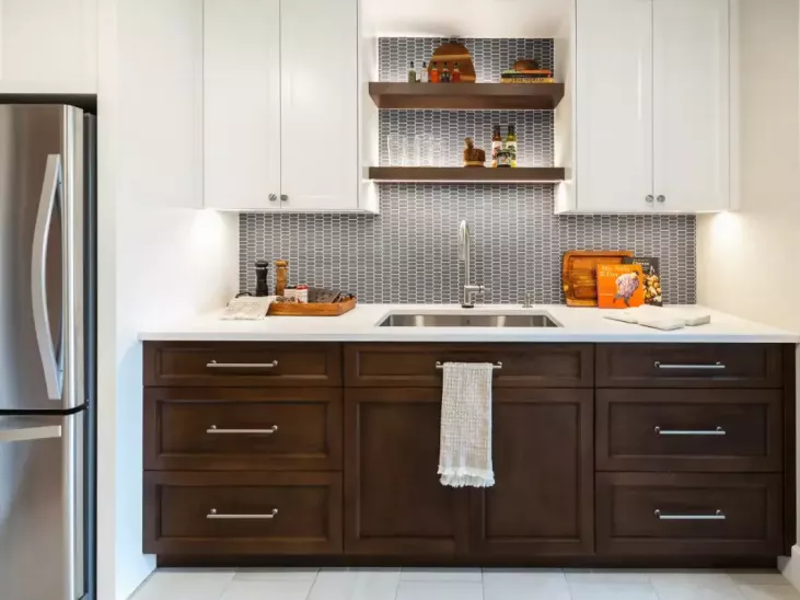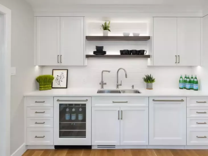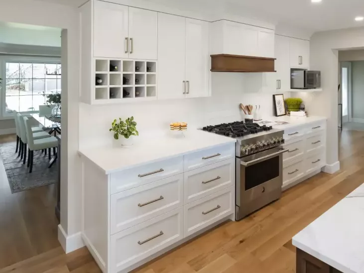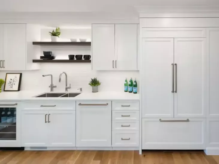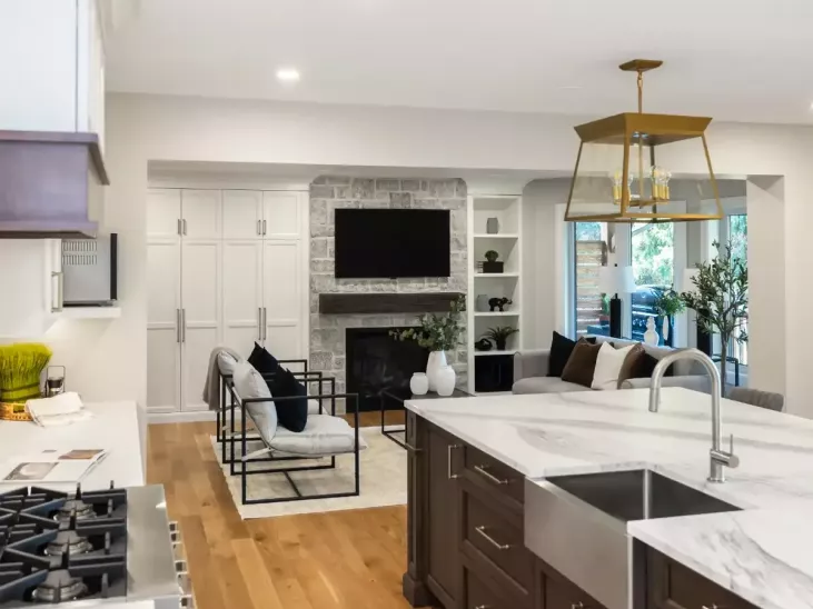 - The Family Room area was awkwardly laid out due to a previous reno and had an undesirable direct line-of-sight to the Powder Room while the Kitchen lacked counterspace, pantry storage and views to the yard and pool. How could all of these spaces work together for everyday but also for entertaining?